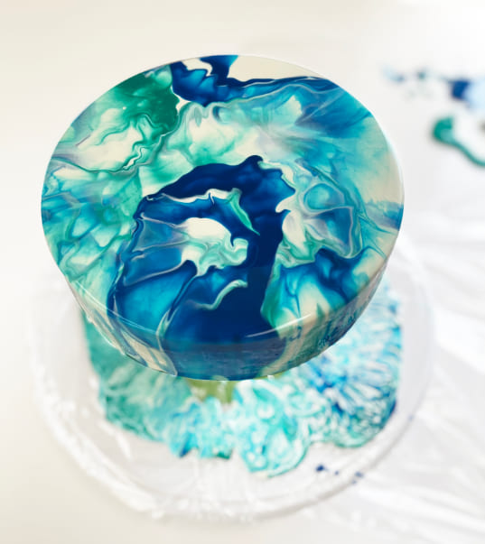 Hay dos tipos de acabados, son completamente lo opuesto. El glaseado es brillante y con este se pueden crear patrones impresionantes. El acabado terciopelo, es una fina capa de chocolate que se aplica a una temperatura caliente sobre el entremet congelado y es así como se logra su apariencia terciopelo, este queda completamente mate.